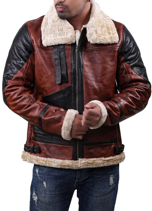 A classic style reinterpreted for this season, our shearling style combines classic design with the pure luxury of the distressed leather jacket. The faux shearling is given as an internal layer that is unusual. The distressed brown color is amazing to create your facade dazzling. A black leather patch on the shoulder and black leather stripes are the main highlights of this jacket. Double belted fur collar is looking viable. The front opening is given through zipping. Shearling Jacket Men’s has two side waist zipper pockets. Both sleeves are full in size. Two inside pockets are present to carry valuables. Shearling cuffs and waistline of Men’s Distressed Leather Jacket are exclusive.