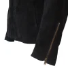 The item itself is made of soft black suede with a gunmetal zip on the front. It has two front pockets which are cut into the front dart seams (in the film they are handstitched at the top, but our jacket is NOT).